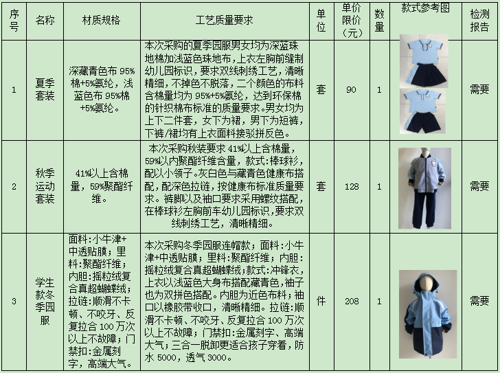 5.項目概況:本項目為常州市新北區(qū)新橋街道中心幼兒園園服采購項目,包括園服制作、運抵、卸貨至采購人現(xiàn)場指定位置,通過采購人及其他相關部門的驗收,直至發(fā)放和余貨取回等全過程工作。其中每套園服包含:夏季套裝1套,秋季運動套裝1套、冬季園服1件。成交單位需等到采購人新生報到,征得2/3以上家長同意后,雙方才履行合同,采購人負責將采購款式、數(shù)量交予成交單位,成交單位按照采購人提供的款式、顏色要求制造校服,校服面料必須與采購需求中一致。貧困學生校服征訂工作按教育主管部門相關文件執(zhí)行。成交單位還需要承擔其他班級園服的增訂工作,具體數(shù)量價格按照現(xiàn)有標準實行。