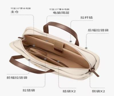 3)款式要求:橫款長(zhǎng)方型公文包拉鏈開(kāi)袋且內(nèi)部有拉鏈暗袋;車線均勻、工整、精湛、堅(jiān)韌;內(nèi)部:1個(gè)主倉(cāng)、1個(gè)電腦隔層、2個(gè)插袋、1個(gè)拉鏈袋;外部:1個(gè)前幅拉鏈袋、1個(gè)后幅拉鏈袋、2個(gè)側(cè)袋、1個(gè)拉桿插;可手拎,帶有可拆卸/調(diào)節(jié)肩帶(可單肩,可斜跨),帶有便攜拉桿帶,可固定在行李箱拉桿上。